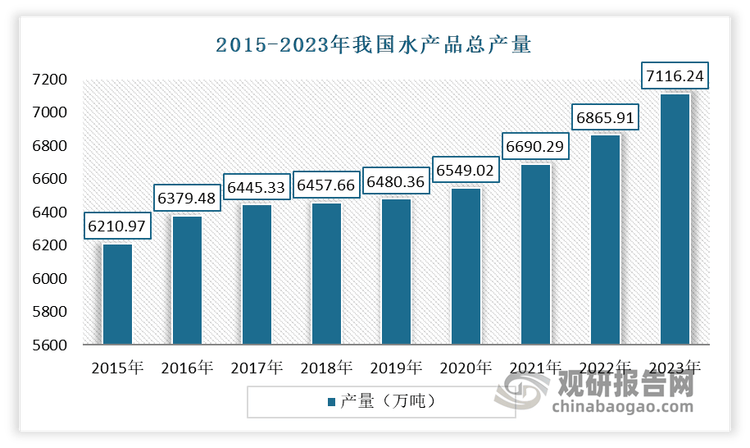 近年跟着我国水产操行业稳步推进,成长规模不竭扩大,产量快速提拔。自1989年起,我国水产物总产量持续33年居世界第一,占到世界总产量的40%以上。按照国度统计局数据显示,2023年我国水产物总产量逐年递增达7116。24万吨,比上年增加3。65%;此中养殖产量占比达81。9%。