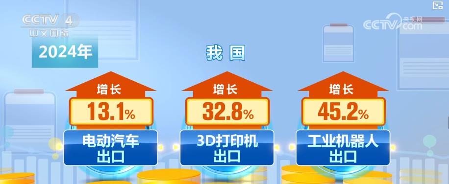 我国外贸出口布局持续优化,产物“新”意更脚,更多高科技属性的新产物加快出海。2024年,我国电动汽车、3D打印机、工业机械人出口别离实现了13。1%、32。8%。