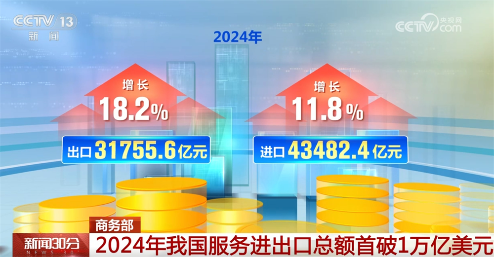 商务部数据显示,2024年,我国办事商业实现快速增加,全年办事进出口总额初次冲破1万亿美元,规模创下汗青新高,布局持续优化,展示出广漠的成长潜力。中国全年办事进出口总额75238亿元,同比增加14。4%。此中,出口31755。6亿元,增加18。2%;进口43482。4亿元,增加11。8%;办事商业逆差11726。8亿元,比上年削减314。3亿元。